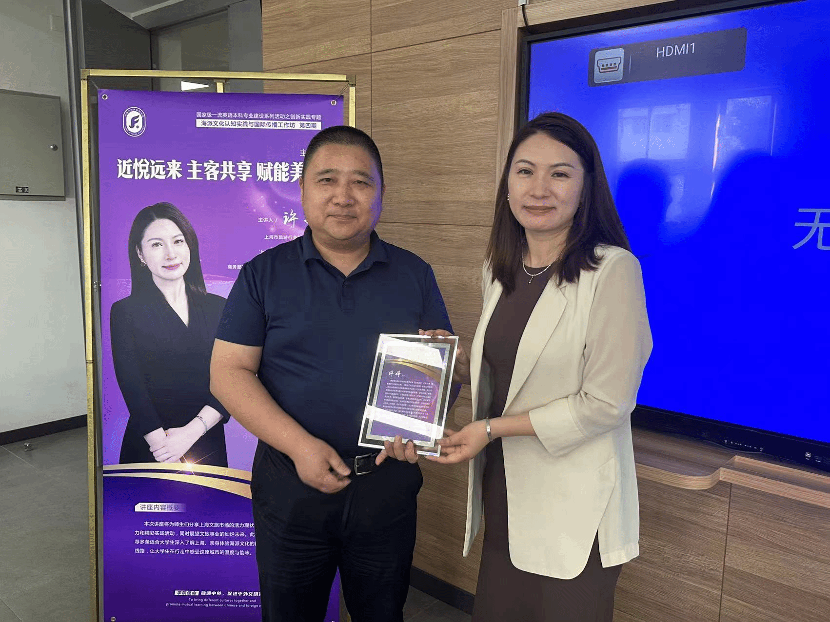 随后,戴朝晖副经理对许老师的分享进行了总结发言,表达了对同学们了解上海故事、讲好上海故事的期盼;在互动环节,许老师详细地为同学们答疑解惑。活动最后,戴朝晖老师为许婷老师赠予了感谢证书,并合影留念。