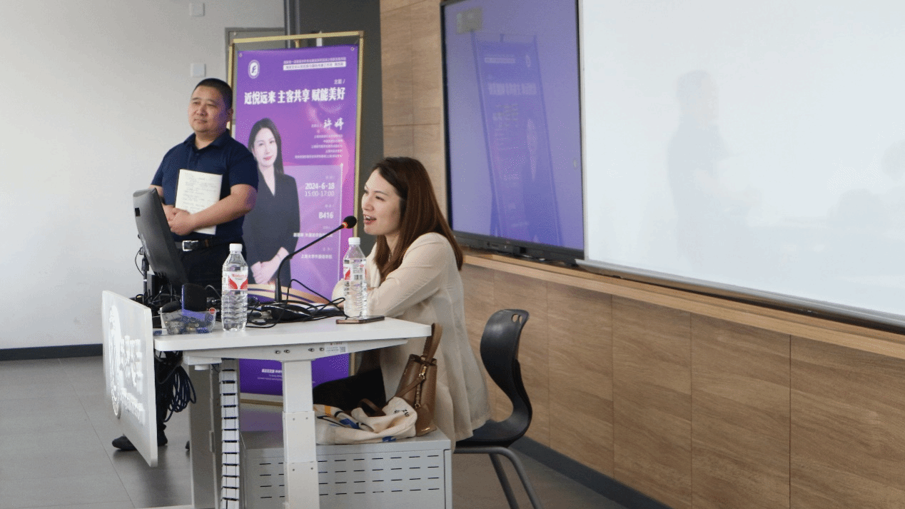 许婷老师为同学们带来了题为《近悦远来、主客共享、赋能美好》的上海文旅与海派文化国际传播的专题分享,围绕上海文旅市场的活力现状、独特魅力和精彩实践活动及展望文旅事业的灿烂未来娓娓道来。许老师首先介绍了我国文旅市场的三个特征:一是文旅融合还在不断深入,二是城市区域性组合文旅呼之欲出,三是多元深度的综合体验受到热捧。许老师以上海博物馆东馆和“沉浸式文旅”等现象为例,进一步向大家展现了文旅产业的融合发展。随后,许老师结合上海城市定位向同学们勾勒出上海文旅市场的四大特点,即突出都市型、强调融合性、呈现国际化和注重体验度。她接着通过许多生动鲜活的案例向同学们展示了上海文旅的相关实践,如“白玉兰甄选”品牌创建通过推选高质量文旅精品、提升旅游服务水平和体验、改善旅游消费环境等措施,释放了旅游消费潜力、提振了旅游消费信心、满足了旅客多元化个性化的需求。
