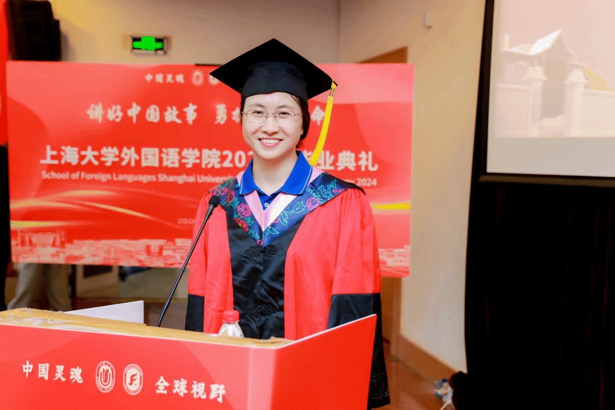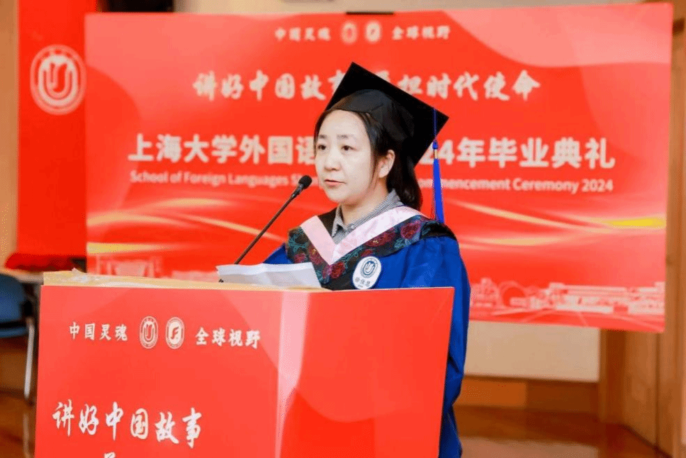 上海市优秀毕业生沈璟萱同学提及大学四年丰富多彩的校园生活,尤其是作为2024年度大戏导演的过程中感受到中外文明互鉴的魅力,表示身为外院学子们今后会继续努力做好中国故事的讲述者。