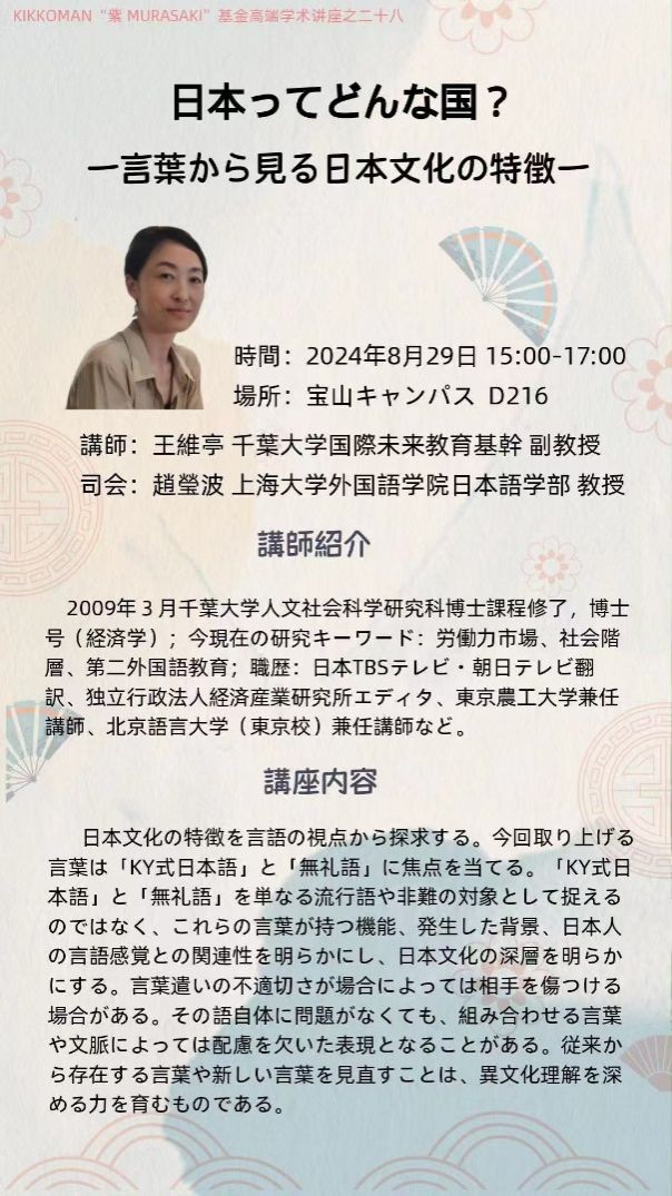 8月29日下午,3044永利集团日语系在D216教室举办“MURASAKI”基金系列讲座——“日本是一个怎样的国家?——从日语用词来探索日本文化的特征”。
