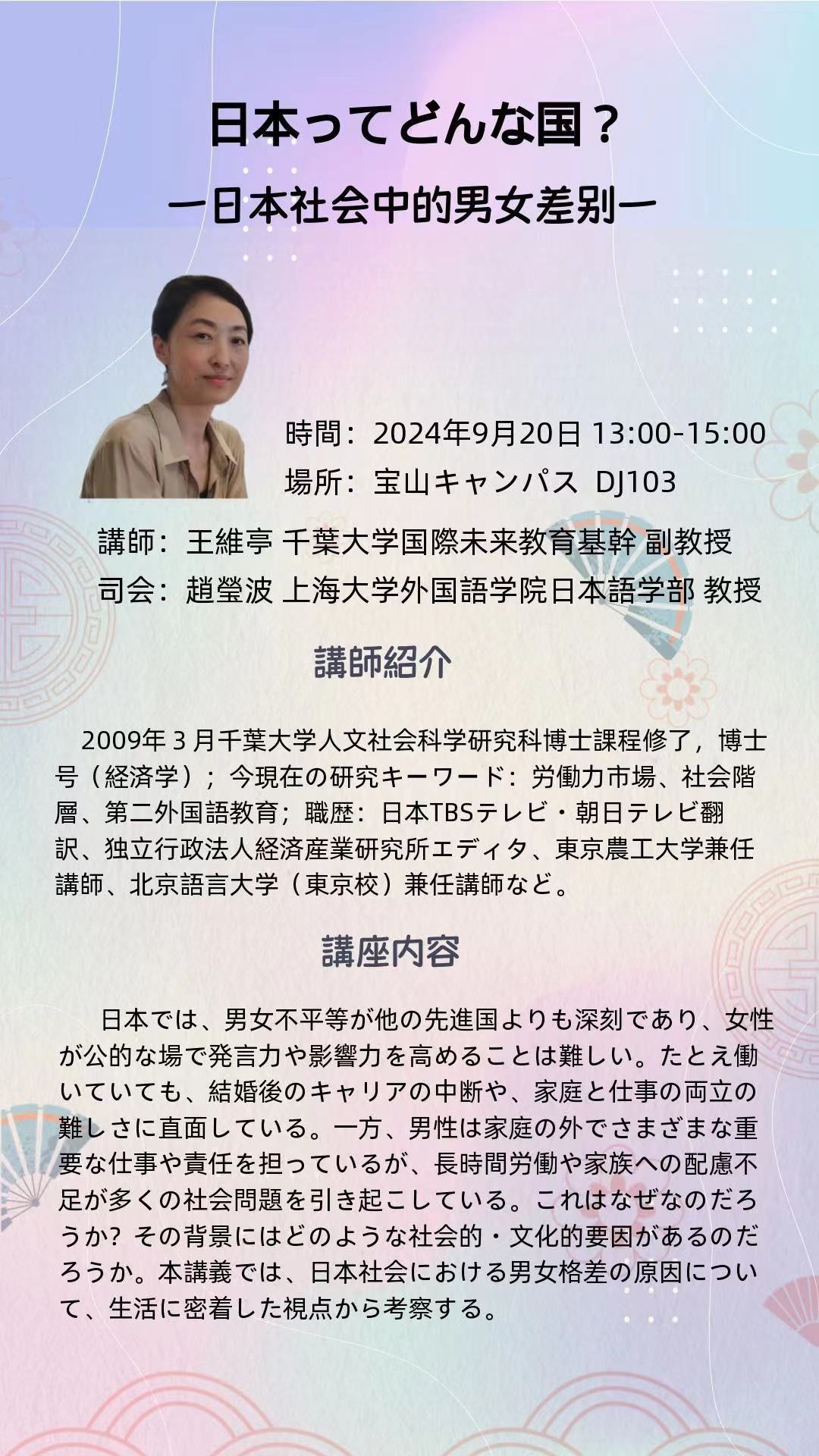 9月20日下午,3044永利集团日语系在DJ103举办主题讲座——“日本是一个怎样的国家?----日本社会中的男女差别”。讲座邀请千叶大学国际未来教育专家王维亭老师主讲,日语系主任赵莹波教授主持。