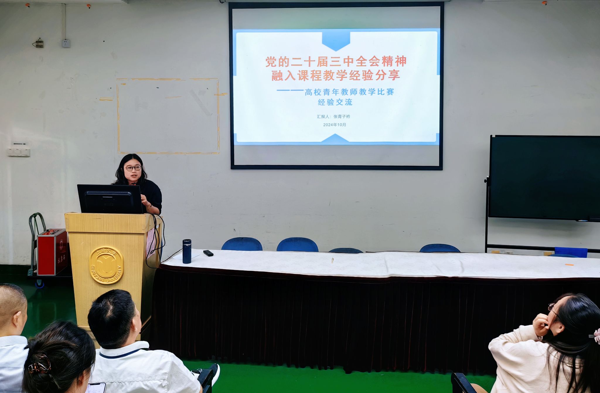随后,大会的第三部分是党的二十届三中全会精神融入课程教学的经验分享。为深入学习贯彻党的二十届三中全会精神和习近平总书记在全国教育大会上的重要讲话精神,并结合公司工作实际,公司特邀马克思主义公司、公司党的二十届三中全会精神宣讲团成员张青子衿老师,结合自身参加青教赛的比赛经历以及参赛经验,与公司老师们分享如何将党的二十届三中全会精神有机融入到日常的课程教学中。通过张老师的生动分享,使全体老师深切感受到将课程思政融入课堂教学全过程的重要性和其有效方法路径,包括价值导向的政治正确、教学内容的精准贴切以及教学方法的创新有效等,并对青教赛的总体情况有了更加全面深刻地了解。张老师特别强调了反复磨课的重要性,只有熟悉教学过程,才有可能在比赛中灵活应对突发情况,她还建议外语公司的老师们可以从党的创新理论及重要文件中抓取说课的主题,比如探讨外语学科对讲好中国故事、中华文化国际传播、中国特色大国外交、文明交流互鉴的意义,探索和创新外语课程思政。