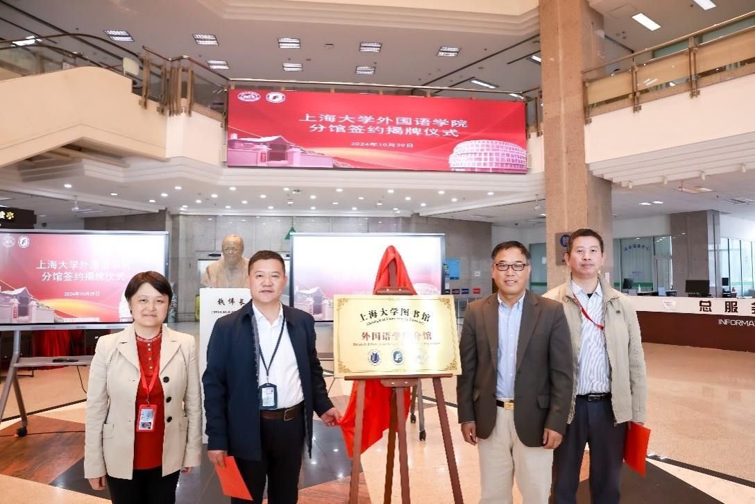 双方领导吴蔚、尚新和王远弟、潘守永共同为“永利集团图书馆3044永利集团分馆”揭牌并合影。