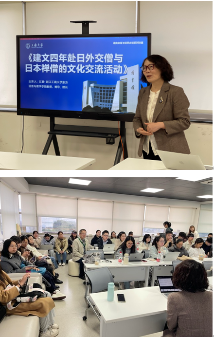 讲座伊始,江静教授首先梳理了建文四年(1402年)明朝外交僧人出使日本的历史背景。随后,江静教授详细介绍了明使与日本禅僧绝海中津、天章澄彧、岐阳方秀等人的交往,以及他们在诗文、佛法等方面的往来互动。绝海中津作为日本五山文学的重要人物,与明朝僧人之间的诗文唱和,不仅加深了两国文化的交流,也促进了中日佛教思想的相互影响。天章澄彧在《栖碧摘藁》中记录了他与明使在北山法住寺的交流活动,包括亲自拜访、诗文互赠和书信往来,他对明使的文学才华表示赞赏,这些互动加深了双方的文化交流和友谊。岐阳方秀则通过信函交流,向明使请教佛法,请求禅师开示、答疑解惑,并请求赠送字号、室铭及书籍,展现了日本僧人对明朝文化的尊崇和追求。