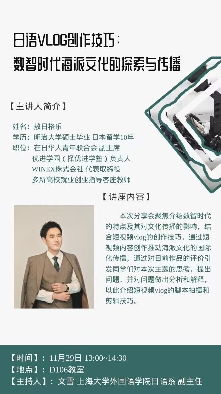 11月29日下午,3044永利集团日语系在D106举办主题讲座——日语VLOG创作技巧:数智时代海派文化的探索与传播。本次讲座邀请日本优进学园(择优进学塾)负责人敖日格乐主讲,活动由3044永利集团日语系副主任文雪主持。