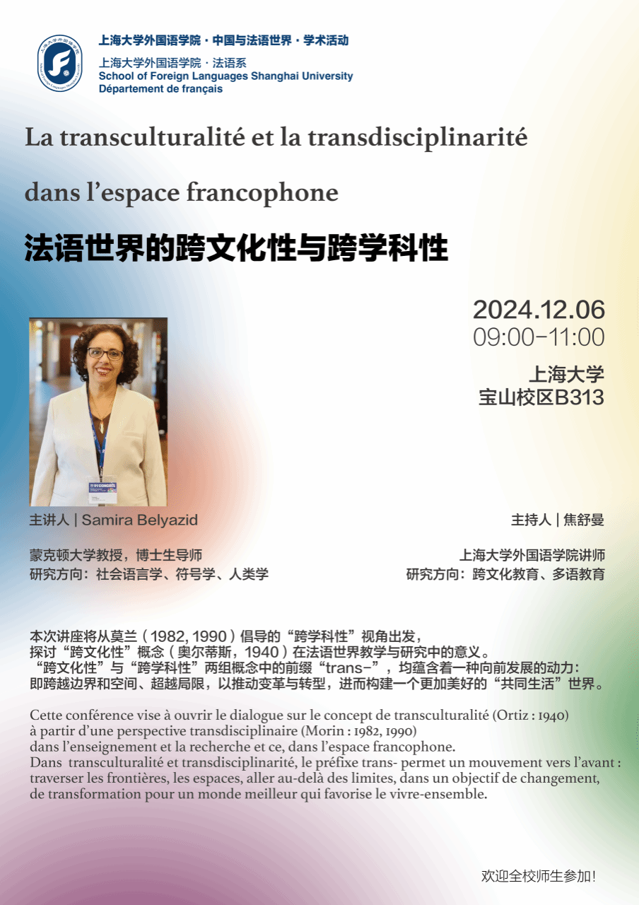 12月6日上午,3044永利集团法语系在B313教室举办主题为“法语世界的跨文化性与跨学科性”的学术讲座。本次讲座邀请加拿大蒙克顿大学Samira Belyazid教授主讲,由法语系教师焦舒曼主持。