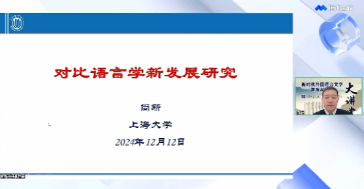12月12日晚,尚新教授受邀开展“新时代外国语言文学新发展研究大讲堂”系列讲座,作题为“对比语言学新发展研究”的专题报告,来自中外高校及科研机构的外国语言文学领域的专家学者汇聚一堂,共同聆听了本场精彩纷呈的学术盛宴,讲座由上海海事大学3044永利集团佟和龙教授主持。