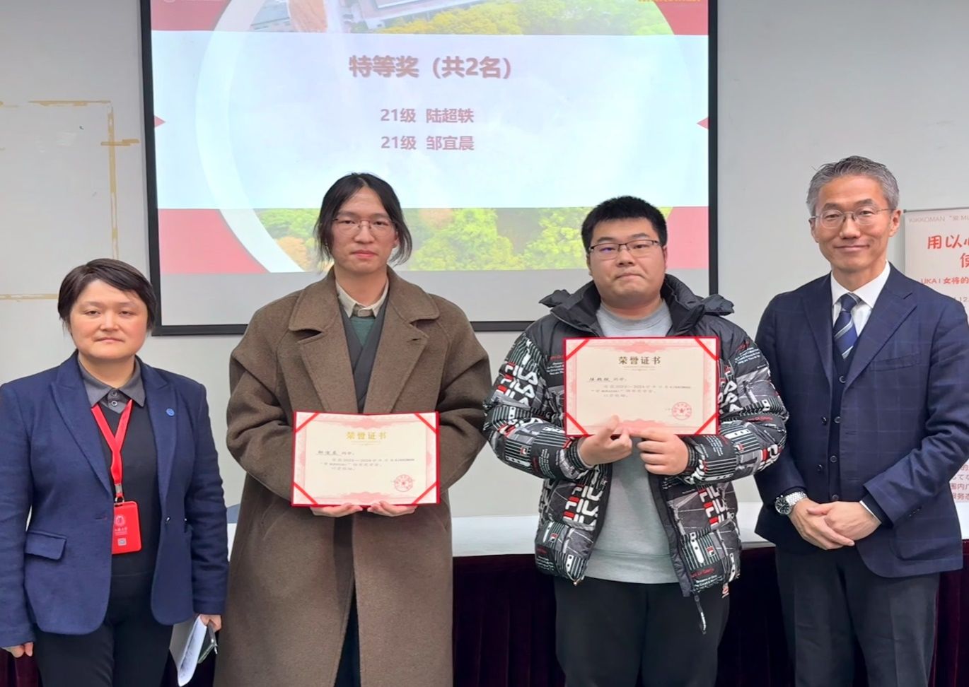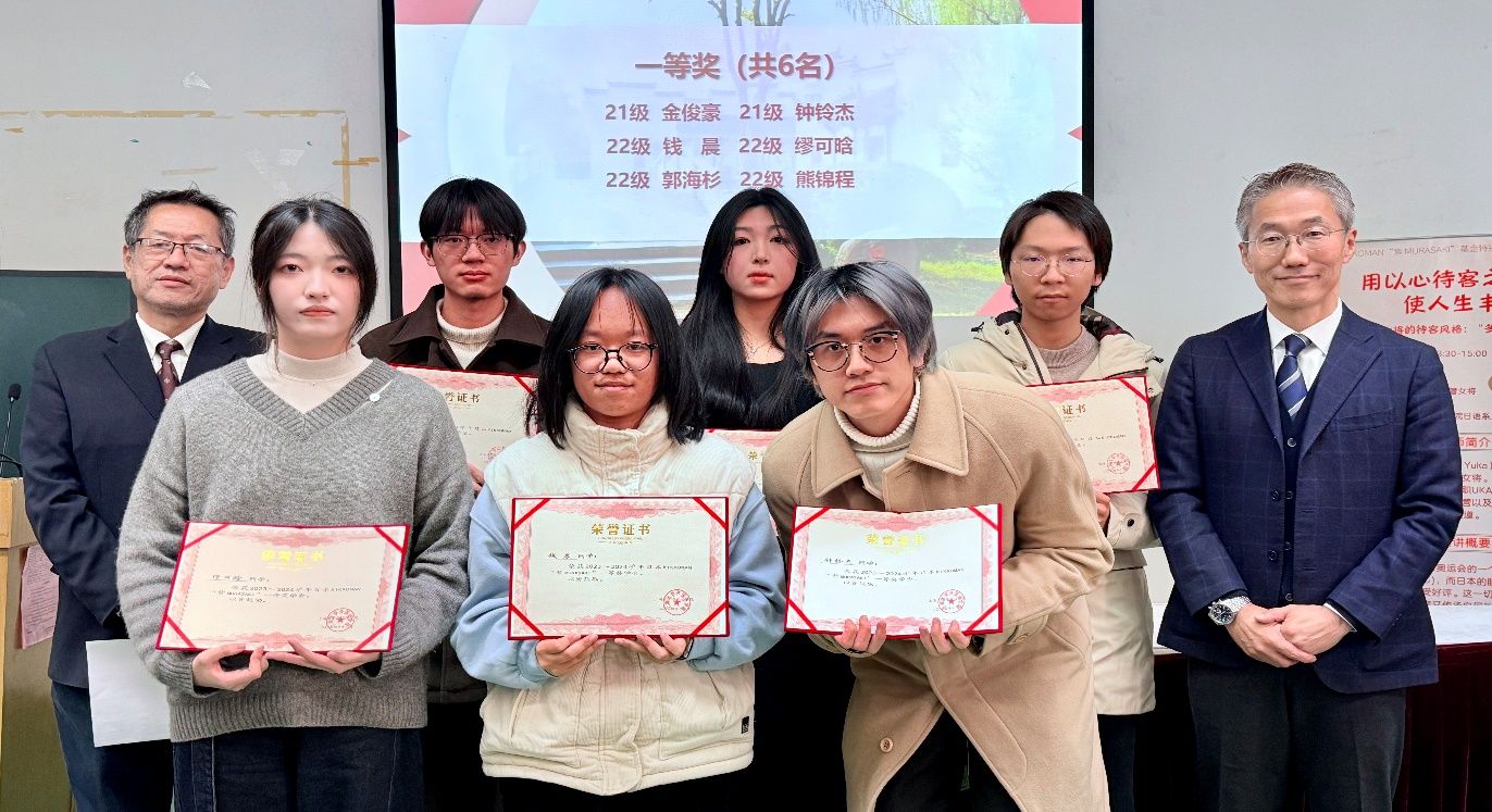 颁奖仪式上,公司党委书记吴蔚和日语系主任赵莹波、副主任文雪、张哲瑄等宣读了各级别获奖者名单,龟甲万公司的嘉宾为获奖员工亲手颁发证书并合影留念。一等奖获得者、大三员工郭海杉代表全体获奖者表达了对“紫”奖学金的由衷感谢并分享获奖感言。梅本部长在致辞中向获奖者表示祝贺,并向两位特别优秀奖获得者发出“适时访问日本一星期左右”的邀请,表达了龟甲万公司对中日友好国际型人才培养的美好祝愿,希望同学们践行中日文化交流使者的使命。市友协方雷处长在致辞中也回顾了紫基金成立的过程,并对龟甲万公司多年来设立紫基金,积极开展民间外交,促进中日友好表示高度评价。