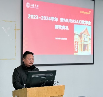 随后,举行了2023-2024学年KIKKOMAN“紫 MURASAKI”基金奖学金颁奖仪式。上海市对外友协方雷处长,龟甲万海外管理部部长梅本洋先生,秋元壮介科长以及海外管理部项目负责人大泽绫女士,公司党委书记吴蔚,党委副书记、副经理贾小琴,日语系主任赵莹波和副主任文雪老师、张哲瑄老师以及近百名日语系师生参加了讲座和颁奖仪式,仪式由日语系廖瑞平老师主持。