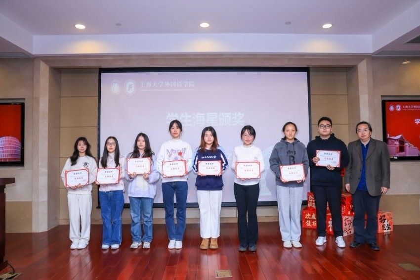 法语系系主任王文新老师为自强之星汪语晨、汤静怡、柴雨涵、徐菁怡同学和文体之星严思婕、管畅、孔令璇、赫薄然同学颁发荣誉证书,激励他们依靠顽强意志,在逆境中挺立,于险阻中前行,不断突破自我,实现飞跃。
