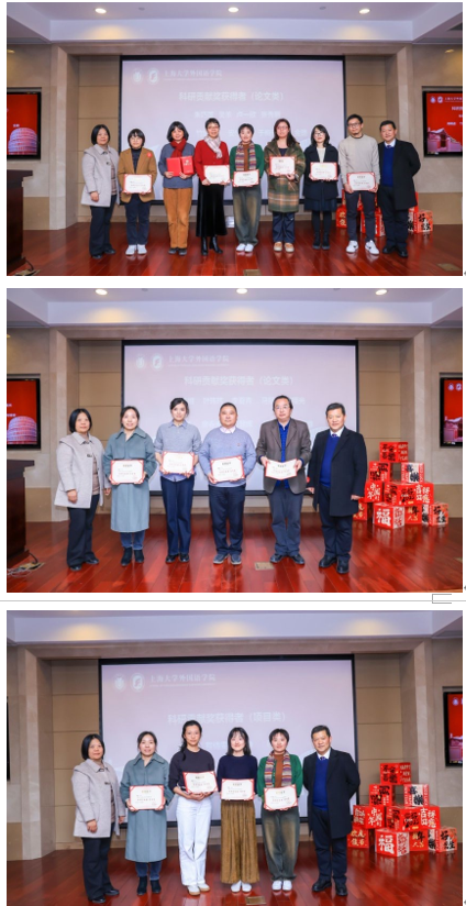 表演过后,尚新经理、唐青叶副经理为朱巧莲、吴羊、卢一欣、张秀丽、尚晓进、竹旭锋、安宁、于梅欣、金璐、曾桂娥、叶玮玮、李夏青、马拯、苗福光、邵庆华、房春光、戴朝晖、傅敬民、向维维等老师颁发论文类科研贡献奖,为卢一欣、程倩雯、陈静、马拯老师颁发项目类科研贡献奖,表彰他们在学术道路上的卓越成果与深厚造诣,在科研追求上孜孜不倦、矢志不渝、求真务实的工匠精神。