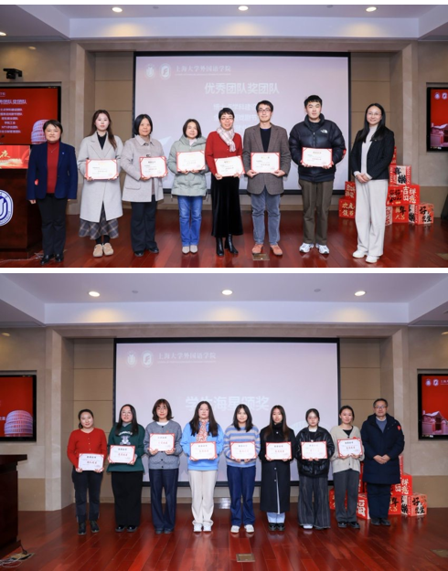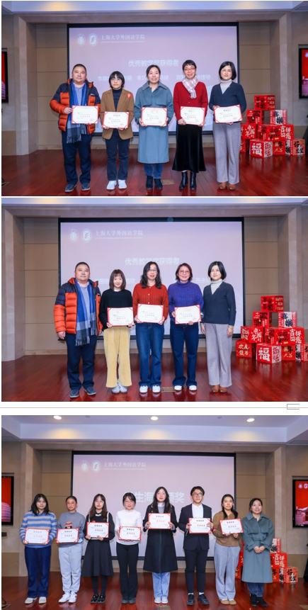 吴蔚书记、贾小琴副书记为博士点团队建设团队、全国英语戏剧节团队、人才招聘团队、公司工会、MTI评估团队、非全日制管理团队颁发优秀团队奖,表彰他们出色的组织协调与高效的执行力,推动公司建设取得显著佳绩。日语系系主任赵莹波老师为党员之星张秋月、毛璐楠、郭歆怡、宋佳莺同学,志愿之星刘艺、徐昕妮、易吟雪、沈晓华同学和团队之星研究生党建中心颁发荣誉证书。