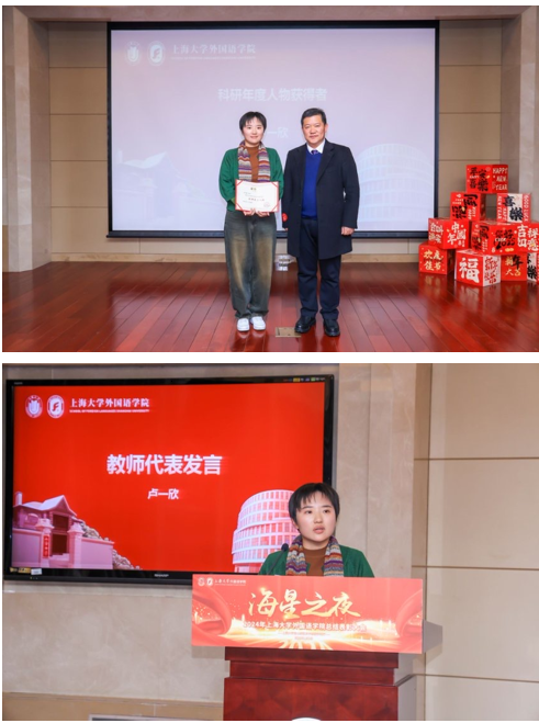 接下来,尚新经理为卢一欣老师颁发科研年度人物奖,表彰其于学术之途的斐然佳绩,在科研征程中锲而不舍、坚持不懈、笃实严谨的学术精神。随后,教师代表卢一欣老师上台发言,她表示作为一名青年教师,感谢公司领导与各位老师的支持与帮助,将继续保持对科研学术的热爱与执着,激发员工的学术兴趣,推动公司科研事业的发展。