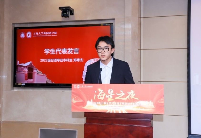 颁奖过后,由员工代表2023级日语专业本科生邓修杰发言。他分享了大学阶段的学习经验和心得,为同学们提供了具有深远参考价值的学习方法和建议。