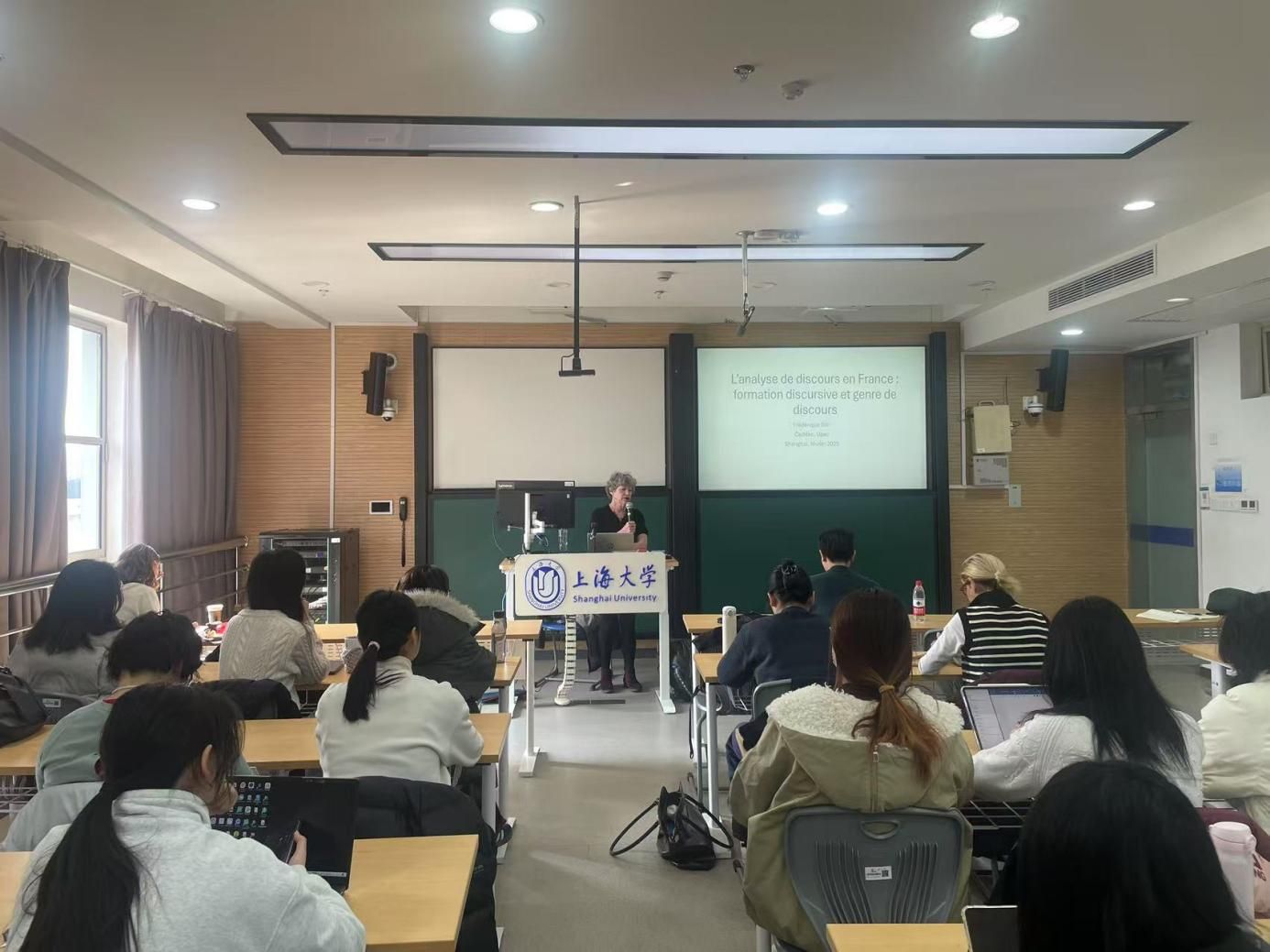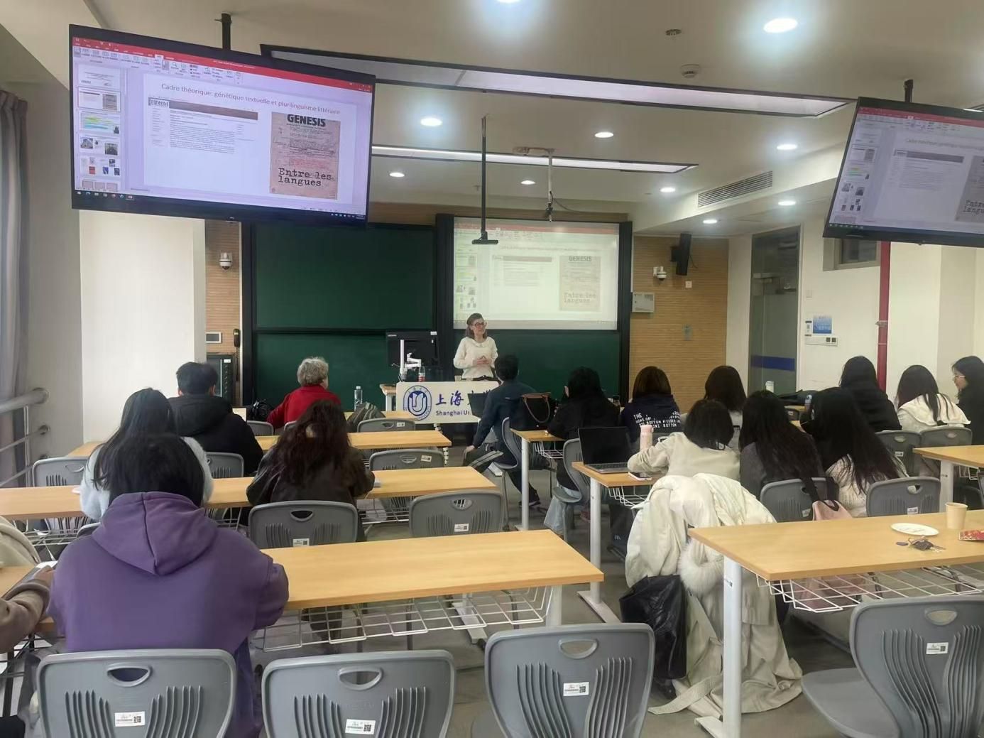 讲座由法语系顾晓毅博士主持;法语系副主任向维维副教授、赵倩博士、中欧工程师公司法方副经理Laure Minassian副教授、金闪闪、张少琼老师以及四十多位本硕同学参加。