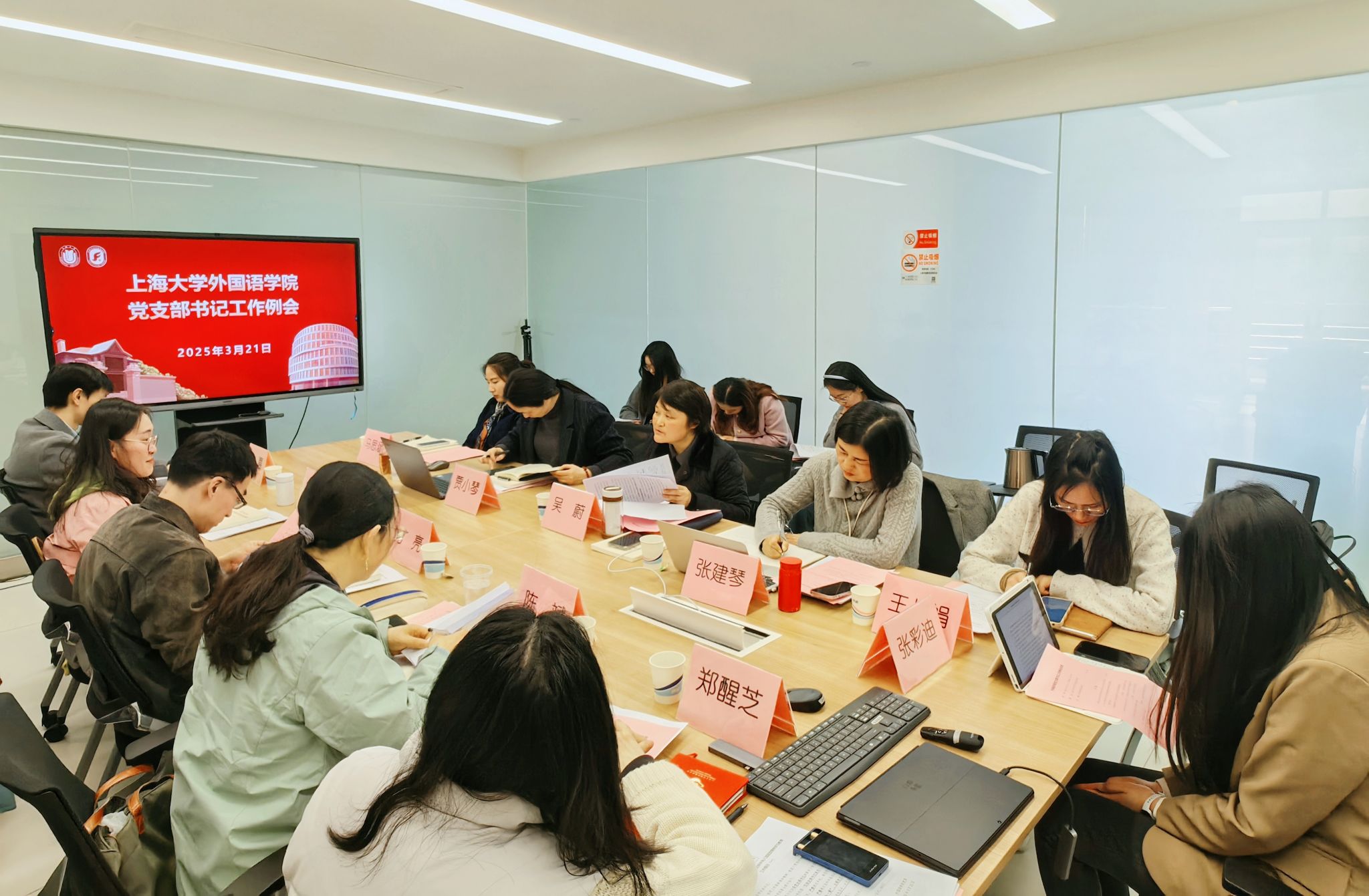 为深入学习贯彻习近平新时代中国特色社会主义思想,扎实推进党的建设和全面从严治党工作,推动党建工作与国际交流及人才培养深度融合,3月21日下午,公司党委在宝山校区C414b会议室召开了新学期第一次党支部书记工作例会,公司党委书记吴蔚,党委副书记、副经理贾小琴,党委委员、副经理张建琴,全体师生党支部书记参加了会议。本次会议由吴蔚书记主持。