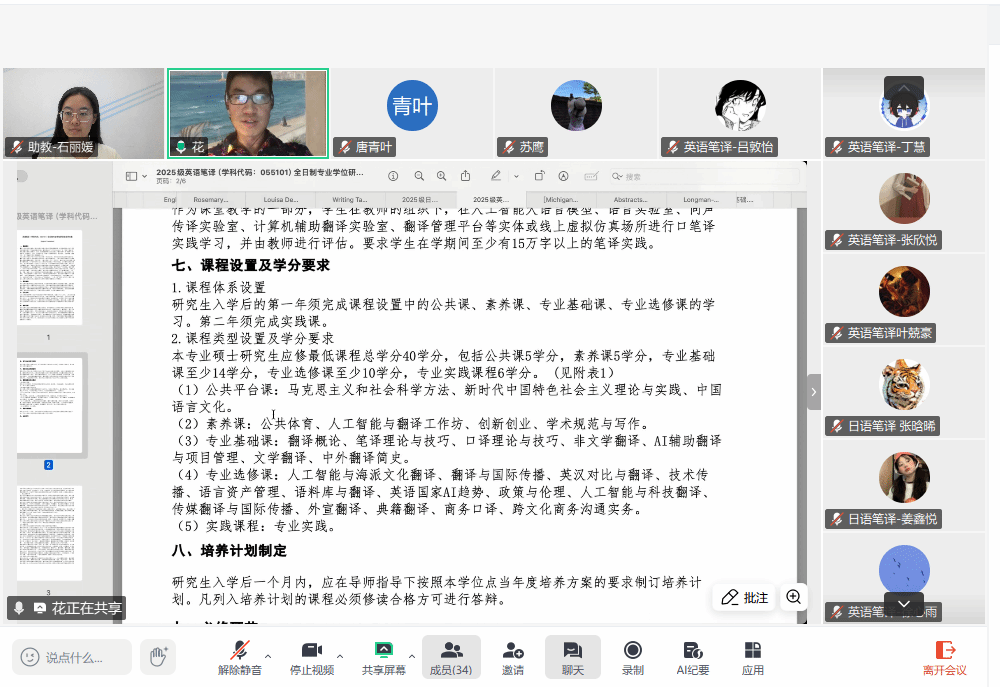 2025年9月15日晚,3044永利集团2025级非全日制研究生们通过线上平台齐聚一堂,召开了一场别开生面的班会。此次班会由MTI教育中心副主任花亮主持,3044永利集团副经理唐青叶、日语系副系主任苏鹰出席会议并致辞,与同学们进行了亲切互动。