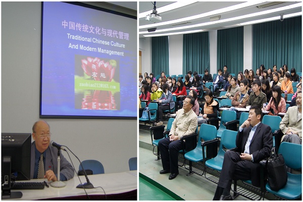 4月23日下午,上海市科技翻译学会会长左飚教授应邀莅临3044永利集团,以"中国传统文化与现代管理"为题给全院研究生做了生动的学术讲座。左飚教授通过发掘中国传统文化的三大支柱,即儒家思想、道家思想和法家思想的精华,探讨其运用于现代管理的可行性,以求发扬光大。左教授对儒家思想作了概要性介绍,涉及儒学的性质、核心思想、主要观念,以及"内圣外王"这一儒家学者所追求的最高境界等,进而探讨如何把"仁"、"义"、"礼"、"信"等观念运用于"以人为本"、"以德治理"等现代管理实践。讲座剖析法家思想中关于"法"、"势"、"术"观念的合理成分,并探讨其与现代组织"依法治理"、"公开、公平、公正"的制度建设、"责权分明"与"奖优罚劣"等管理原则的结合。关于道家思想,讲座重点介绍"道法自然"、"无为而治"、"尚水"与"贵柔"等观念,探讨现代组织运用道家思想,以求达到"顺应自然,遵循民意,把握规律,避免极端"的管理至高境界。左教授还简要介绍了西方哲学关于管理美德的探索、西方现代管理理论的主要流派及其与中国传统文化的契合之处。最后,左教授对于儒家思想、道家思想和法家思想的精华如何运用于不同类型的现代组织及其不同的发展阶段作了概要的总结。