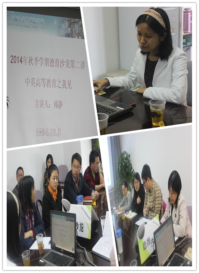 韩静老师首先从整体上简明扼要地概括了英国高等教育的四个特点——授课时间短、讲座和小组讨论为主、辅以实验室学习和以社会需要为考量,如此教育特点让人耳目一新。接着,她从入学条件开始详细地介绍,也向大家展示了英国唯一的私立大学,即白金汉大学,图文并茂,饶有趣味。在谈及中英高等教育在具体形式上的区别时,她解释说,英国大学较之我国大学在学位获得的年限上有一定的差别,配以图表呈现,让在座老师一目了然。韩静老师还向我们讲述了英国高等教育中另一种形式——sixth form,旨在以职业导向和考取证书为教育指南。此外,她还提到,英国启发式、对话式的教学方法在一定程度上与我国传统的灌输式和独白式存在差异;在论文写作上,她以自己从师的亲身经历指出,中英高等教育在对员工理解问题能力和发现问题能力的处理上也有不同侧重;在治学精神上,她表示,英国教育比较注重师生平等和学术严谨。总结时,她还特别提到,英国互动式教学方法和高密度的知识传授以及富有人性化的"员工手册"让她印象深刻。
