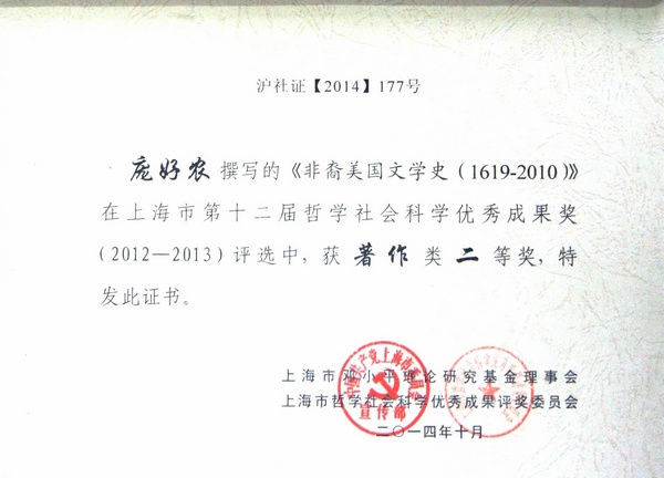 年11月6日,上海市社会科学界第十二次学术年会暨上海市第十届邓小平理论研究和宣传优秀成果、上海市第十二届哲学社会科学优秀成果奖颁奖大会在上海展览中心举行,永利集团共有20项成果获奖,公司庞好农教授的专著《非裔美国文学史(1619-2010)》获得著作类二等奖,特此祝贺!