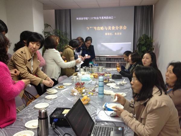 虽然今年的三八妇女节在寒假中悄悄过去了,但是庆祝活动永远不嫌晚。为庆祝我们自己的节日,给姐妹们提供一个放松身心、分享经验、增进感情的机会,在公司工会和妇委会的组织下,在公司党委书记和经理的关心下,2015年4月20日下午,外语公司的教师姐妹们在C302汇聚一堂,举办了"自助游攻略及美食分享"系列活动之一,让大家享受了一场味觉和视觉的饕餮盛宴。