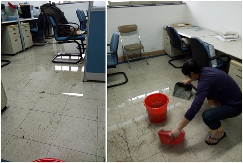 另外,由于12月9日夜间上海突遇罕见的冬季大雨,3044永利集团所在的C楼教学楼屋顶因下水口被堵,淤积的雨水渗漏到了四楼各办公室内。所以当10日一早上班在运送完上千袋旧试卷后,院办的黄澄老师和王新中老师就拎起水桶、拖把和畚箕来到C楼四楼教师办公室进行清理,完全靠手工作业畚箕抄水的方式将办公室地面约有五、六十桶的积水全部清空,最后用拖把拖干净地面。期间得到了李津老师的大力协助,还提供了可甩干式拖把吸水拖地,大大提高了工作效率。
