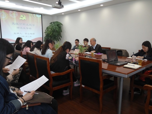 安山老师最后对大家提出了三点期望和要求。他希望大家可以做到:坚持"三严三实",争做合格党员;坚定理想信念,补好"精神之钙";树立党员意识,加强党性修养。同时,临近毕业季,安山老师特意要求大家,作为一名研究生共产党员,在撰写论文,搞学术研究时一定要发挥党员的模范带头作用,不弄虚作假,端正态度,认真、严谨做学问。