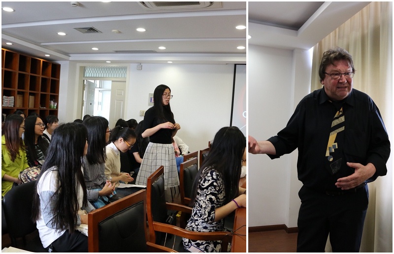 整场讲座围分为三大部分展开。在第一部分中,De Laet教授向大家概述了东西方近现代笔译与口译的发展历程。他以纽伦堡审讯的翻译案例为例,回顾了翻译辅助设备的演变史,指出同声传译设备的发明改变了国际会议口译的方式。同时,他对比了口笔译的发展历程,指出笔译和口译都属于语言调节的范畴。他以汽车销售广告几十年来的变迁出发,引出竞争型商业中语言调节的重要性。在第二部分中,De Laet教授以"在多语种环境下我们怎样相互理解"为出发点,概括并阐明笔译、口译以及语言调节应遵循的基本原则。他提出语言、技能、知识是解决这一问题的三大柱石,并列举出多个由于语言表达错误而引起误解的案例,强调精准的翻译在跨文化语际交流中的重要性。在第三部分中,De Laet教授指出了口笔译工作者应掌握的专业技能。他从翻译实例出发,指出员工首先应培养分析文本的能力,在充分理解文本信息后才能开始着手翻译。他还提出了学界最新关注的一个焦点,即视译与语音识别相结合,激发了现场师生对翻译实践与研究的浓厚兴趣。