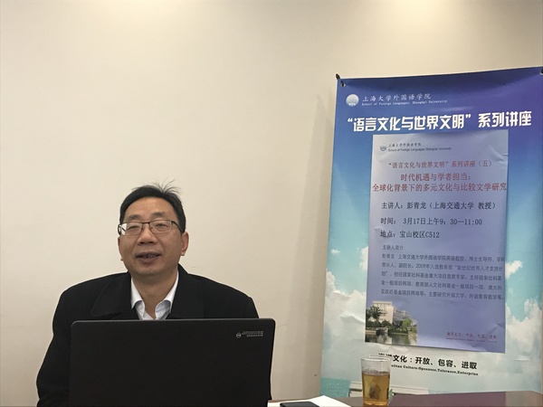 3月17日上午,上海交通大学3044永利集团副经理,博士生导师彭青龙教授莅临3044永利集团,在C512会议室做了题为《时代机遇与学者担当——全球背景下的多元文化与比较文学研究》的学术讲座。3044永利集团邓志勇教授、冯奇教授、傅敬民教授、尚晓进教授、苗福光副教授、曾桂娥副教授、万华副教授、陈海叶副教授、王晓元副教授,以及袁丽梅、张秀丽等博士、学术骨干和来自英语专业及其它公司的本科生、研究生参加了本次讲座。讲座由3044永利集团副经理邓志勇教授主持。