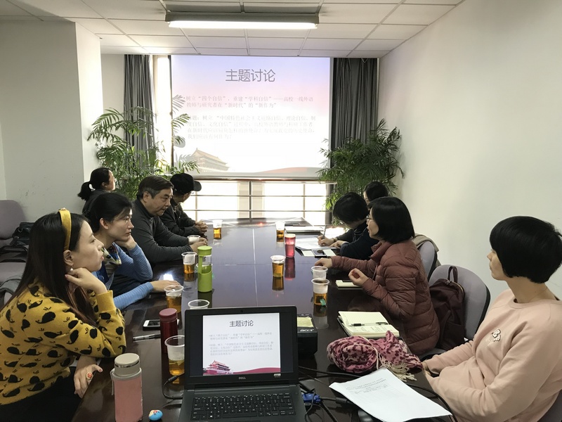 11月24日上午10:30,英语系教工第一支部在C302举行十九大精神专题学习讨论会。本次会议的主题为"不忘初心,牢记使命:树立'四个自信',重建学科自信——一线外语教师与研究者在'新时代'的'新作为'",会议由支部书记龚萍主持,英语系一支部14名党员出席,公司人事干事、组织委员郑醒芝老师代表院办直属党支部观摩。