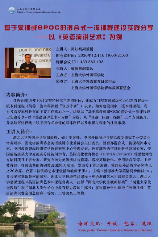自教育部19年10月发布经过三年左右时间,建成万门左右国家级和万门左右省级一流本科课程(简称一流本科课程“双万计划”)以来,如何建设国家一流本科课程,成为各高校本科教育的主要工作重心之一。讲座以“基于慕课或SPOC的混合式一流课程建设实践分享--以《英语演讲艺术》为例”为题,从“寻路、问路、探路”三个方面展开,分享如何建设线上线下混合式金课的具体路径以及申报过程中的注意事项。