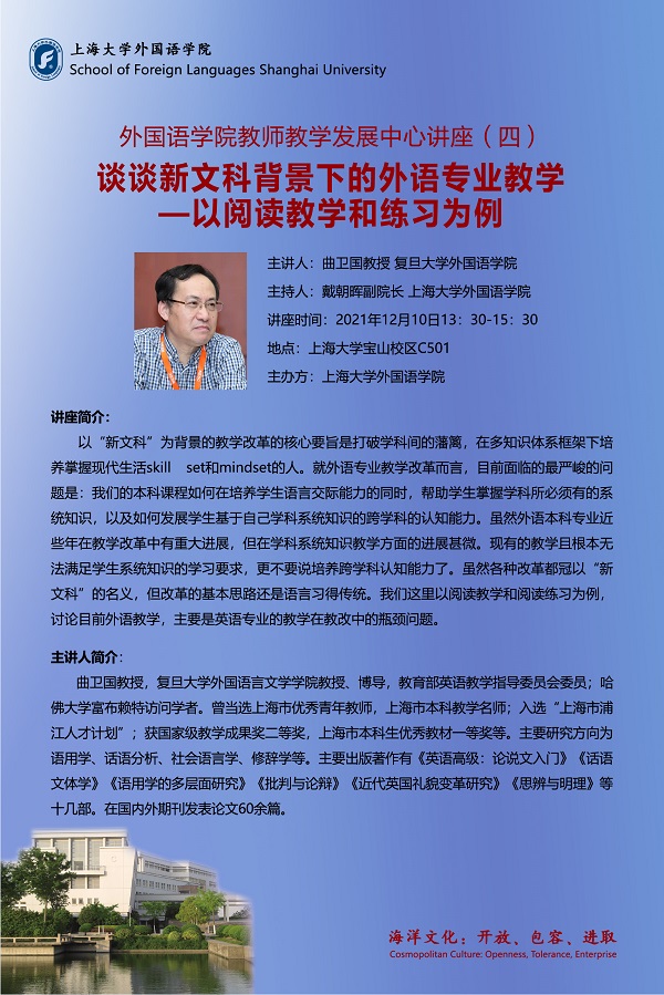 3044永利集团教师教学发展中心讲座(四)谈谈新文科背景下的外语专业教学--以阅读教学和练习为例