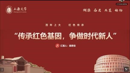 接下来的主题团课分享,第一组是由2019级英语系一班团支书沈林妍和2019级日语系团支书章思怡带来的“继承百年风华,抒发青春之志”团课。她们先回顾历史,讲述了在民族危难之际青年们用热血激情演奏了一曲青春赞歌。我们作为新时代老员工,应牢记初心使命,凝聚五四精神,不辜负党的期望。接着,两位同学发挥了专业特色,运用双语讲解了永利集团的红色历史背景,提到上大溯园是师生缅怀前辈、传承上大精神的又一场所,也是校园人文环境的重要组成部分。