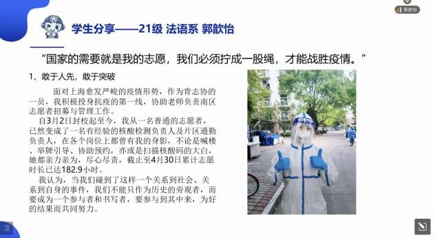 第三组是由2020 级英语系团支书洪玉敬和2020级法语系团支书金怡文共同分享的“赞吾辈之楷模,担时代之重任”团课。金怡文先为我们介绍了蔡和森先生的生平,据此引到五四时期的赴法留学潮,讲述了其起源、发展、低潮、衰落,以及带来的积极影响。接着洪玉敬介绍了瞿秋白先生在任教老永利集团期间深受员工欢迎,创办《中国青年》,后为青年教育做出巨大贡献;最后洪玉敬分享了习近平总书记对广大青年的寄语,勉励同学们坚定理想信念,夯实人文根基,发挥人文专业对社会的力量,让世界更好的读懂中国。
