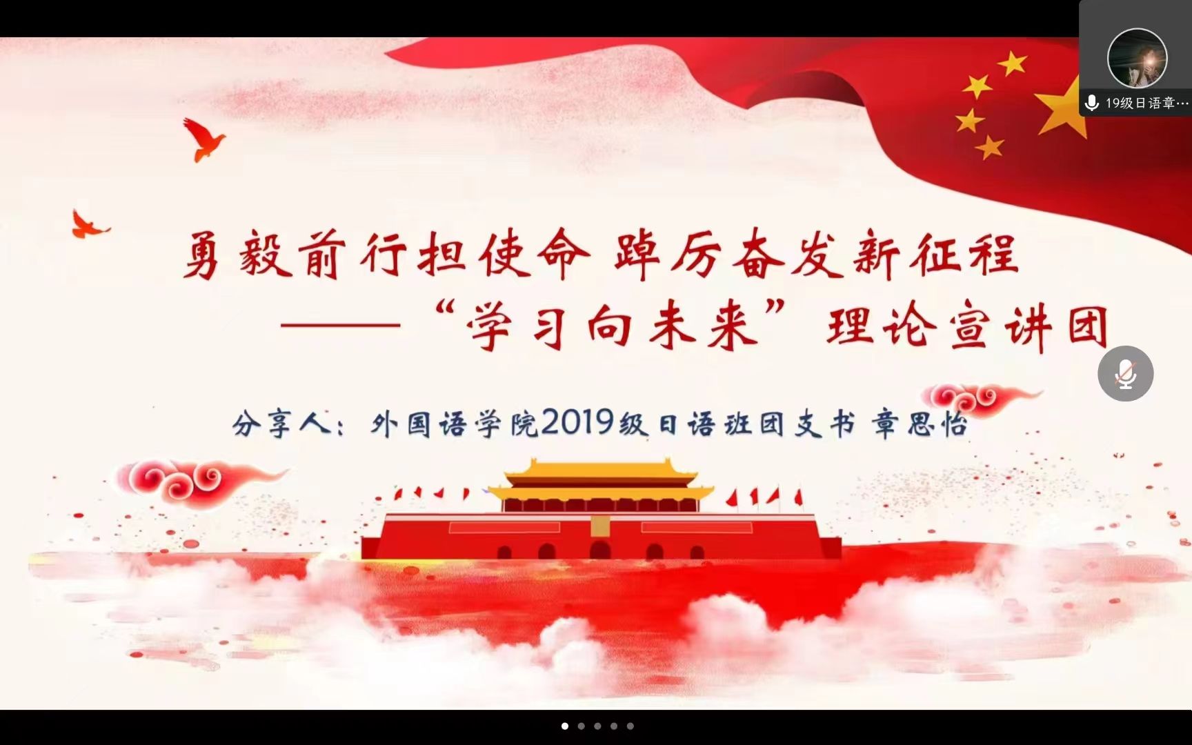 最后,“学习向未来”宣讲团成员、2019级日语系章思怡同学带来了“勇毅前行担使命,踔厉奋发新征程”的主题宣讲。宣讲从党的二十大精神指示,溯源百年上大,新青年如何在新时代中踔厉奋发、勇毅前行等三个部分进行讲述,呼吁同学们勇担时代重任,争当新时代优秀青年。