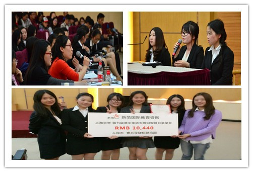 公司11级英语系顾沁媛、吴蕾、徐玮组成"The One"团队参赛,并一路过关斩将,与其他三支优胜队伍晋级决赛。决赛现场模拟股东大会场景,三位同学以新颖的跨界思维、流利的英语口语、自信的舞台风采向在场评委和观众展示了自己团队的跨行业战略方案,博得了现场专业评委与大众评委的一致好评,最终获得本届商业英语大赛决赛一等奖。