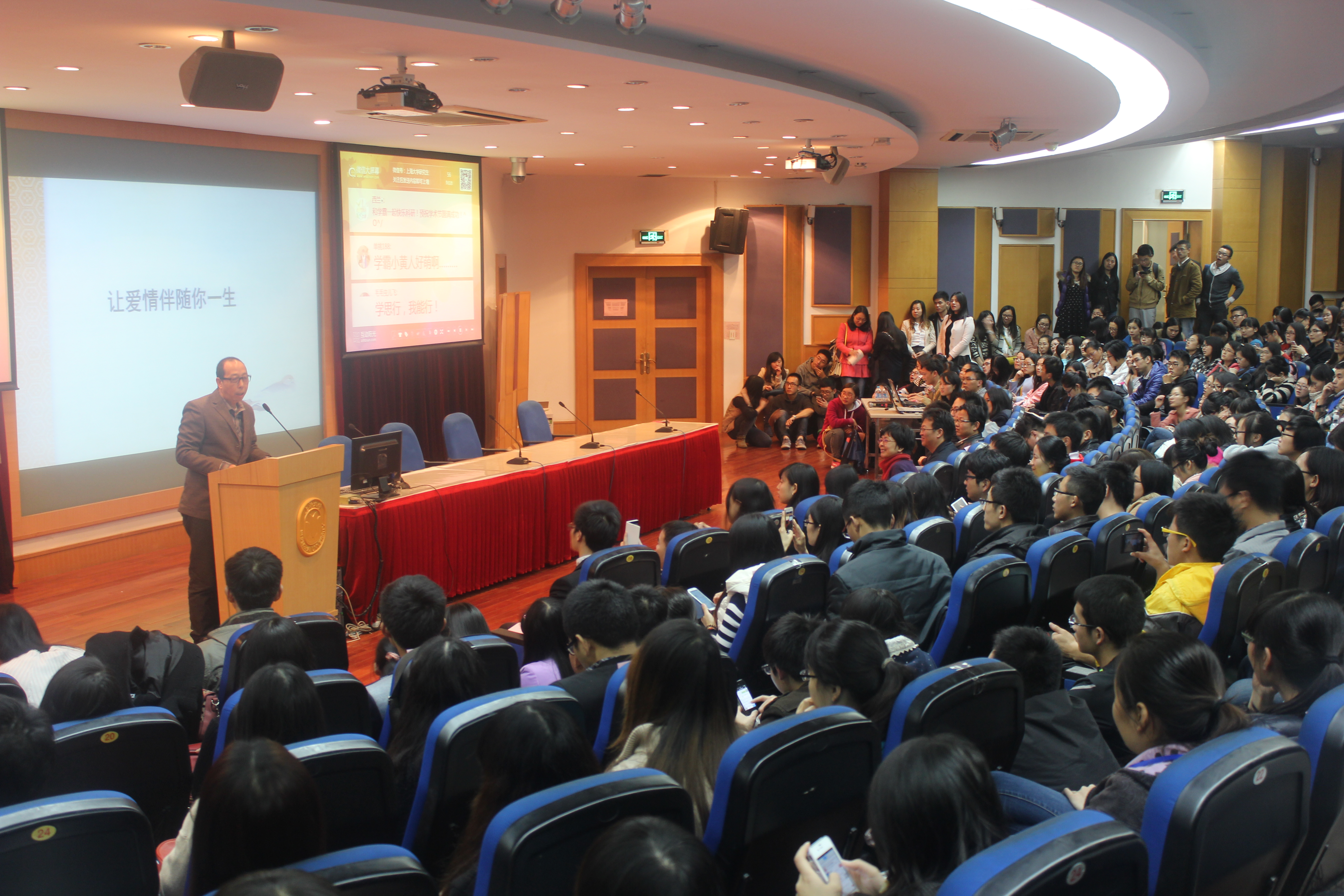 最后,教授着重强调了爱情是需要维护的,并且以自己与妻子之间的故事为例,亲身讲述如何维护爱情。"夫妻之间,争论出谁对谁错有什么用呢?在我眼里,我老婆永远是对的。"教授坚定地说道。这句话再一次掀起了热烈的鼓掌。两个人在一起,就应当相互尊重、信任、体谅,不时还要用赞赏的话语鼓励对方,这样的爱情才会是健康长久的爱情。