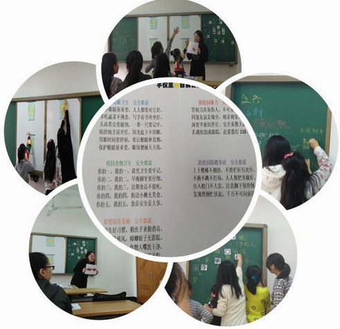 在公司里,知道自我保护的一些知识对小朋友们的帮助是很大的。于是老师特别为小朋友们准备了"集团里自我保护"的这个环节。在一开始,老师给每一个小朋友发了一张彩色的纸片,上面是有关于公司自我保护的歌谣,包括用眼卫生、校园食物卫生、防校园常见病、防校园暴力和防校园踩踏事故等歌谣。志愿者们轮流为小朋友们分析每个小点的注意事项,有些志愿者还与小朋友们分享了自己生活中的小经验,比如说,不小心骨折了应该怎么办呀,在打篮球的时候如果篮球爆炸了应该怎么做呀……过程中小朋友时而微皱起眉头仔细的听,时而听到有趣的事情会扬起脑袋大笑,气氛很好。