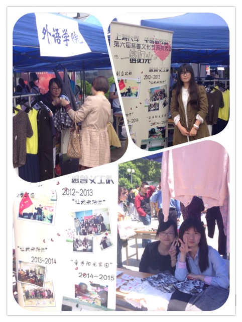 在爱心义卖活动筹备阶段,义工队员们分头行动,有的设计易拉宝做展架,有的走到同学寝室号召各位同学捐献物资,献出自己的一片爱心。在义卖的两天时间里,公司义工队的队员们当起了小卖家,尝试着吆喝,向在摊前徘徊的同学们介绍所卖物资。在这两天时间里,义工队员们在买卖之中接触了校内外形形色色的人,有看中了衣服的阿姨,有校内前来淘宝的同学,当然也有仅仅是以献爱心为目的而买一些小物品的同学。在义卖过程中,难免也会有一些突发情况。比如有位阿姨第一天买的衣服第二天却来退货,还有一位奶奶在别的摊位质问所售水杯的使用情况,但是这些问题在义卖志愿者们的耐心沟通下最后都一一解决了。正是在大家的努力下,这次义卖活动得以圆满的落幕。