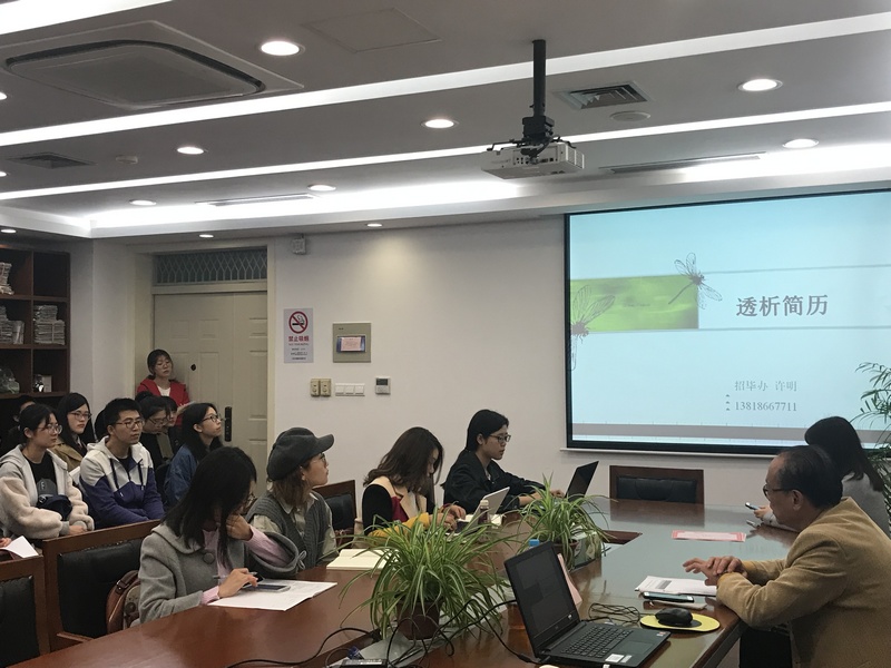 接着,许明老师从他的角度跟大家分享了他多年从事招毕办工作总结出来的制作简历的方法。"简历既是对自己四年老员工活的总结,也是给HR的第一印象,在求职过程中十分重要。"许老师先指出了本次简历制作大赛的普遍问题:缺少明确的求职意向;没有具体有针对性的自我评价,然后从写简历前的思考及准备工作、简历要素类型和写作原则、如何在简历中弥补劣势、招聘会和宣讲会现场投递注意事项、填写网申明细的注意事项几个方面系统地跟大家介绍了简历投递的整个过程。比如在写简历前应该要了解目标企业及它的招聘要求,了解渠道有很多,但是一定要做足功课,有的放矢;在写简历的时候应该注意自己投递的公司类型、个人信息是否齐全、实践活动是否写具体、是否需要提供中英文简历、排版篇幅是否得当等。优秀的简历各有千秋,要想赢得HR的青睐,在简历制作时应遵循"真实、独特、相关、简洁"四大原则;在递交简历时应准备一个记事本和笔,及时记录简历投递情况,避免海投时过于盲目,减少石沉大海的概率,当然打扮齐整,举止得体也是十分重要的;在参加招聘会时应该提前了解公司背景,如有当场笔试也要做好复习准备,不打无准备的仗。