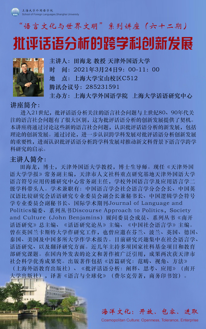 进入21世纪,批评话语分析关注的语言社会问题与上世纪80、90年代关注的语言社会问题有了很大区别,这为批评话语分析的创新发展提供了契机。本讲座将通过讨论这些新的语言社会问题,认识批评话语分析的新发展,包括理论的创新发展。通过讨论,进一步认识跨学科发展对批评话语分析创新发展的重要性,进而认识批评话语分析跨学科发展对推动新文科背景下语言学跨学科研究的启示。