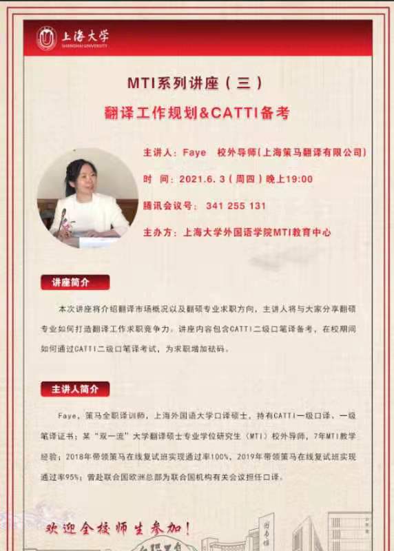 本次讲座将介绍翻译市场概况以及翻硕专业求职方向,主讲人将与大家分享翻硕专业如何打造翻译工作求职竞争力。讲座内容包含CATTI二级口笔译备考,在校期间如何通过CATTI二级口笔译考试,为求职增加砝码。