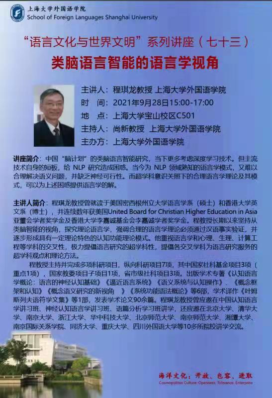 <9月28日>“语言文化与世界文明”系列讲座(七十三期)类脑语言智能的语言学视角