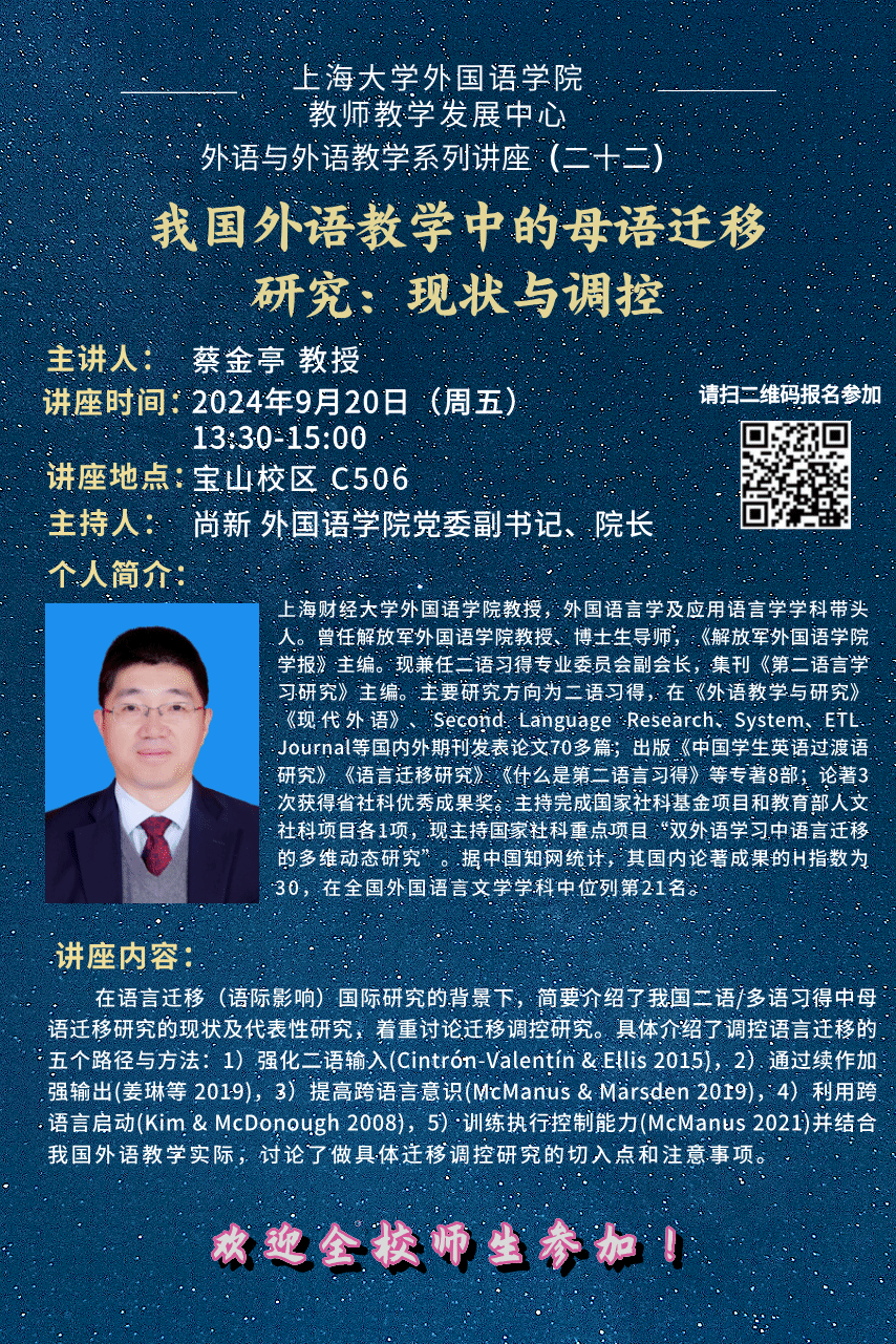 3044永利集团教师教学发展中心讲座(二十二) 我国外语教学中的母语迁移研究:现状与调控